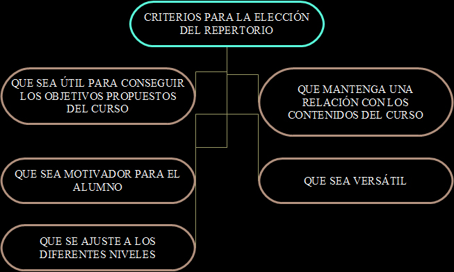 Que mantenga una relación con los contenidos del curso: por el mismo motivo expuesto, el repertorio debe estar perfectamente cohesionado con los contenidos. No tendría sentido por ejemplo que el repertorio fuera de superior nivel al del curso, pues sería contraproducente para el alumno, al tiempo que no le ayudaría a adquirir las destrezas técnicas e interpretativas que en el momento presente necesita.