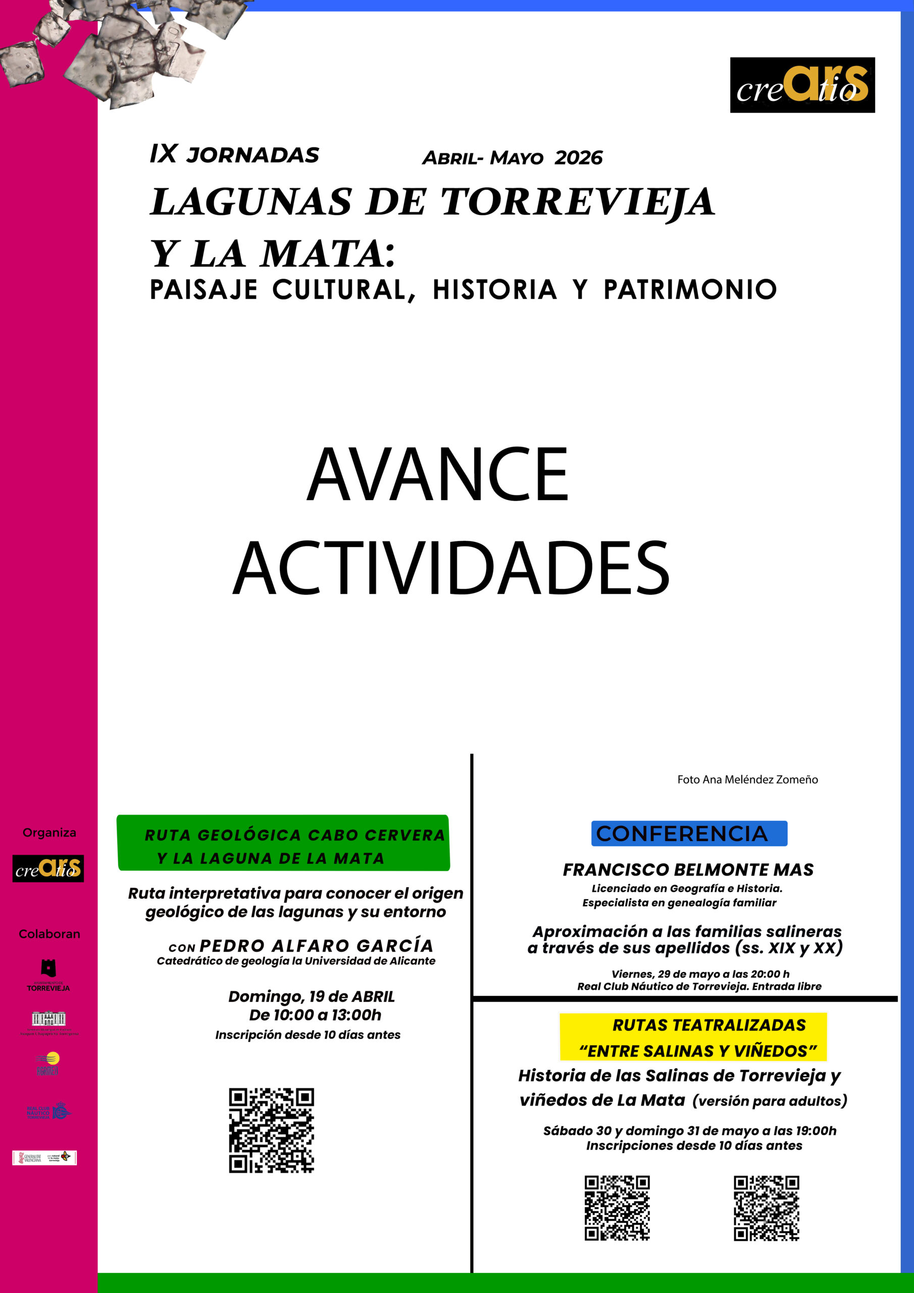 Ars Creatio presenta la novena edición de sus jornadas multidisciplinares dedicadas a las lagunas de Torrevieja y La Mata como patrimonio cultural y natural. AVANCE DE ACTIVIDADES 2026 RUTA GEOLÓGICA CABO CERVERA-LAGUNA